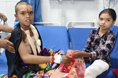 राजस्थान के झालावाड़ में गत 25 जुलाई पिपलोदी स्कूल त्रासदी में घायल 13 वर्षीय विशाल के हाथ में फ्रैक्चर है तो उसकी छोटी बहन शायना के पैर में फ्रैक्चर। दोनों वर्तमान में एसआरजी अस्पताल में भर्ती हैं। रक्षाबंधन के अवसर पर शनिवार को अस्पताल में ही पलंग पर बैठी शायना ने अपने भाई विशाल को राखी बांधी और उसकी बलाएं ली।