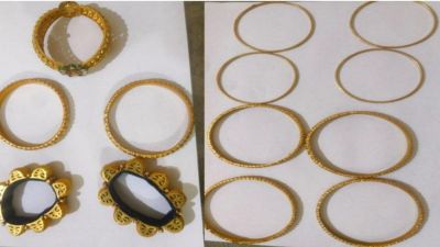 80 ग्राम सोने की चार चुड़ियां, 50 ग्राम सोने की चार चुड़ियां, 60 ग्राम सोने का एक सैट, 140 ग्राम सोने की दो मटर माला, 70 ग्राम सोने का एक कंगन, 30 ग्राम सोने की पाटला चुड़ी, 10 ग्राम सोने की एक चेन, 12 ग्राम सोने की दो चुड़ी, 200 ग्राम सोने के चार गजरे, 20 ग्राम सोने का एक ब्रेसलेट। घड़ी व आठ हजार रुपए भी मिले।