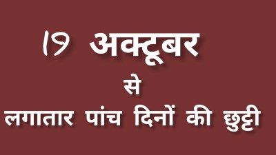 School closed for 5 consecutive days उत्तर प्रदेश बेसिक शिक्षा परिषद से जारी अवकाश तालिका के अनुसार 20 अक्टूबर से 23 अक्टूबर के बीच परिषद के नियंत्रणाधीन विद्यालय, मान्यता प्राप्त विद्यालय बंद रहेंगे। इन दिनों में कोई कामकाज नहीं होगा। लगातार 5 दिनों तक विद्यालय बंद रहेंगे। अदालतों में भी लगातार चार दिनों की छुट्टी है। इसमें एक छुट्टी 26 जनवरी की दी जा रही है। जिला प्रशासन और बैंक यूनियन की तरफ से जारी अवकाश तालिका के अनुसार सरकारी कार्यालय और बैंकों में 20 अक्टूबर, 22 अक्टूबर और 23 अक्टूबर को अवकाश रहेगा।
