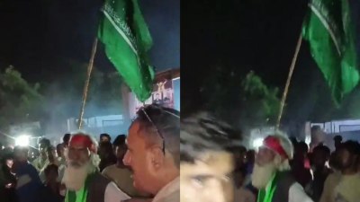 मंगलपुर थाना क्षेत्र के मंगलपुर तिराहे पर शाम के समय रावण दहन का कार्यक्रम चल रहा था। जिसमें बड़ी संख्या में लोग मौजूद थे। इसी बीच सफेद दाढ़ी में एक वृद्ध हरा झंडा लेकर पहुंच गया। जिसमें चांद सितारे भी बना था।