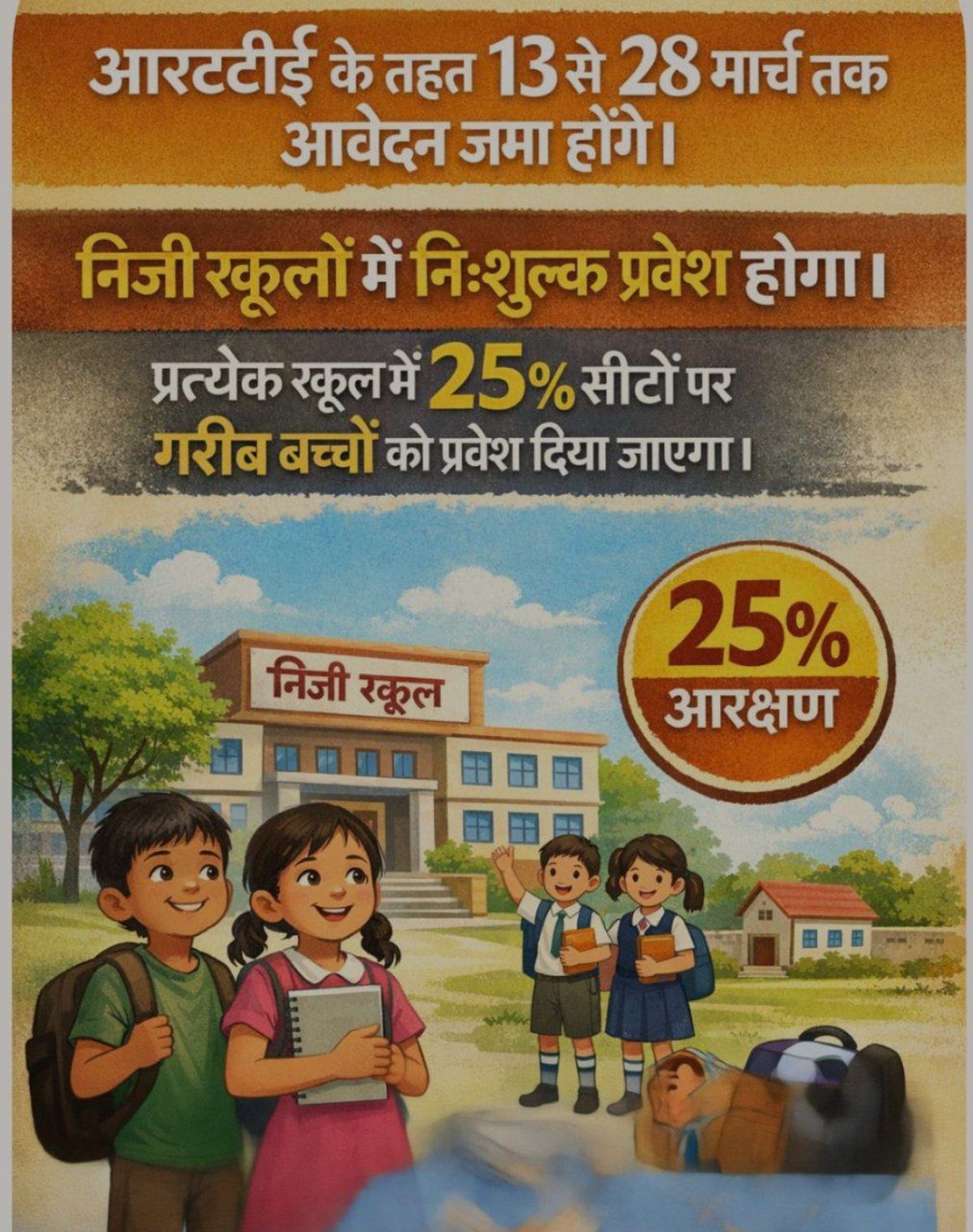 निजी स्कूलों में शिक्षा का अधिकार अधिनियम (आरटीई ) के तहत प्रवेश प्रक्रिया 13 मार्च से शुरू होगी। पोर्टल के माध्यम से अभिभावक 28 मार्च तक ऑनलाइन आवेदन कर सकेंगे। आवेदनों का सत्यापन 14 मार्च से 30 मार्च तक होगा।