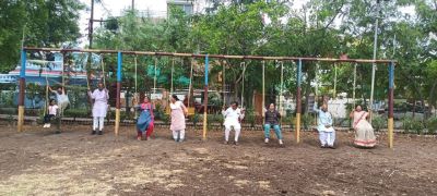 बच्चों के खेलने लगाए झूले, बनाई छतरी