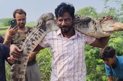 कोटा। कोटा का एक वीडियो सोशल मीडिया पर वायरल हो रहा है। इस वीडियो में एक युवक सात फीट के मगरमच्छ को अपने कंधे पर लेकर घूम रहा है। आस-पास के लोग इस दौरान मोबाइल से वीडियो और फोटो लेते रहे। बाद में मगरमच्छ को चंबल नदी में छोड़ दिया गया।