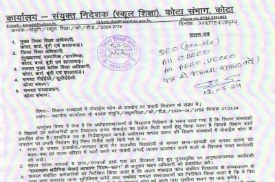 कोटा संभाग के सरकारी व मान्यता प्राप्त गैर सरकारी स्कूलों में मोबाइल के उपयोग पर पाबंदी लगा दी है। स्कूल की टाइमिंग के दौरान शिक्षक, कर्मचारियों तथा छात्र-छात्रा के मोबाइल का उपयोग करने पर कार्रवाई की जाएगी। (स्कूल शिक्षा) कोटा संभाग की संयुक्त निदेशक ने इस संबंध में आदेश जारी कर दिए हैं।