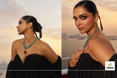 वहीं, हार के अलावा, दीपिका ने अपने लुक को और भी खूबसूरत बनाने के लिए चमचमाते हुए डायमंड ईयर स्टड्स पहने। अपनी ग्लैम लुक के लिए उन्होंने फीथर्ड ब्रोस, शिमरिंग गोल्ड आई शैडो, स्मज्ड कोहल, विंग्ड आईलाइनर, मस्कारा से सजे लैशेस, फ्लशड चीक्स, ग्लॉसी मौव लिप्स, ग्लोइंग हाईलाइटर और हल्का कंटूरिंग किया। उन्होंने अपने बालों को एक Neat बन में बांधकर बेहद बोल्ड और एलिगेंट लुक प्राप्त किया।