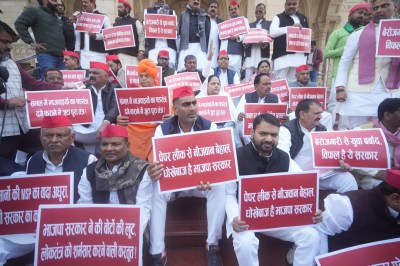 तख्तियों पर लिखे नारे: सपा विधायकों और कार्यकर्ताओं ने तख्तियों पर अपने संदेश लिखे थे, जिनमें प्रमुख रूप से यह लिखा था: