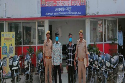 मऊ में लगातार हो रही बाइक चोरी की घटनाओं को रोकने के लिए कोतवाली पुलिस ने अभियान चला कर दो शातिर चोर को पकड़ लिया है। इसके बारे में शनिवार को एएसपी ने कोतवाली में मामले का खुलासा करते हुए जानकारी दी है।
