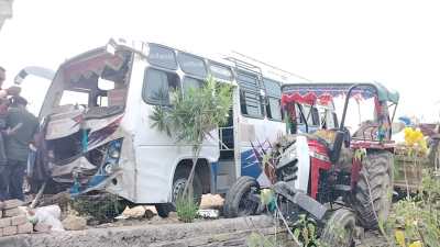 जिले के कैलारस थाना क्षेत्रांतर्गत हाईवे के संत नगर गांव के सामने बारात से भरी ट्रैक्टर-ट्रॉली की भिड़ंत हो गई। यात्री बस सबलगढ़ से कैलारस की ओर आ रही थी। जब कि ट्रैक्टर- ट्रॉली कैलारस से सबलगढ़ की ओर जा रहे थे। ट्रैक्टर ट्राली में सवार सभी बाराती कैलारस के खिरी गांव से शादी कर वापस अपने गांव कुल्होली सबलगढ़ जा रहे थे। बस से हुई दुर्घटना के बाद मौके पर चीख पुकार मच गई। बस और ट्रैक्टर हाईवे किनारे बने एक मकान के दरवाजे तक पहुंच गए। हालांकि उस मकान को कोई क्षति नहीं हुई है। संत नगर के रहवासी एवं हाईवे से गुजर रहे राहगीरों के द्वारा घायलों को वाहनों से बाहर निकाला गया। सूचना मिलते ही मौके पर सबलगढ़ एवं कैलारस थाने की पुलिस मौके पहुंच गई। एंबुलेंस के माध्यम से मृतक एवं घायलों को कैलारस चिकित्सालय ले जाया गया। मृतकों के शवों का पोस्टमार्टम कर शव परिजन को सौंप दिया गया। वहीं घायलों का उपचार किया जा रहा है। मौके पर पहुंची पुलिस ने यातायात को व्यवस्थित करने के बाद कानूनी रूप से करवाई की जा रही है।