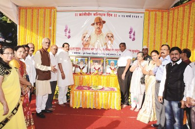मुंबई. क्रांतिवीर बलिदान दिवस पर हुतात्मा राजगुरु चौक में आयोजित कार्यक्रम में तीनों क्रांतिकारी और भारतमाता के सपूतों शहीद भगत सिंह, हुतात्मा शिवराम हरी राजगुरु और शहीद सुखदेव थापर को उनके 88वें पुण्यतिथि और बलिदान दिवस पर माल्यार्पण एवं श्रद्धा सुमन अर्पित कर नमन किया गया। तीनों माटी के वीरों को फांसी दी गई थी। पुणे जिला रहवासी सेवा संघ, मुंबई की ओर से आयोजित इस कार्यक्रम में क्रांतिकारियों को माल्यार्पण किया गया। इस अवसर पर हुतात्मा राजगुरु की पोती उमा महादेवकर, पूर्व उपमुख्यमंत्री अजीतदादा पवार, महाराष्ट्र के मंत्री राज के पुरोहित, पूर्व आमदार बालासाहब दांगट, जगदीश पुरोहित, स.पो.आयुक्त, कोलाबा सुभाष खानविलकर, मनसे नेता अरविंद गावड़े, संस्था अध्यक्ष बाबासाहेब ठाकुर, संस्था उपाध्यक्ष दत्तात्रय वाळुंज, सचिव एड. संतोष शिंदे, खजिनदार महेंद्र ल. गडगे, सदस्य महेंद्र शेरे, दिलीप वीर, सुरेश बवले, बबन बवले, विनय शिरोडकर, मेघा चौधरी, कविता वीर, उषा दुबे, संगीता टावरे व अन्य महानुभावों ने माल्यार्पण और सुमन चढ़ाए। इस हुतात्मा राजगुरु चौक को विकसित कर इस क्रांतिकारी को सच्ची श्रद्धांजलि देने का प्रस्ताव भी लिया गया। इस अवसर पर संस्था अध्यक्ष बाबासाहेब ठाकुर, जगदीश पुरोहित, महादेवकर मौजूद रहे।