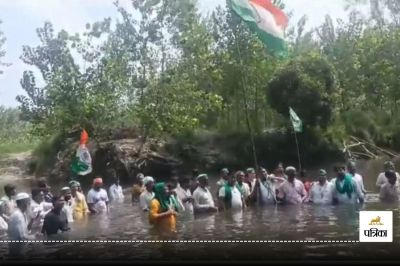 Farmers Hoisted Flag in Water: देश भर में आजादी की 78वीं वर्षगांठ धूमधाम के साथ मनाई जा रही है। सभी सरकारी गैर सरकारी संस्थानों पर ध्वजारोहण किया गया। इस कड़ी में उत्तर प्रदेश के मुजफ्फरनगर जिले में भी तिरंगा फहराया गया। लेकिन यहां एक स्थान पर ध्वजारोहण का नजारा सामान्य नहीं था। थाना चरथावल क्षेत्र के सिकंदरपुर गांव में भारतीय किसान यूनियन के कार्यकर्ताओं ने हिंडन नदी में ध्वजारोहण और राष्ट्रगान कर स्वतंत्रता दिवस मनाया।