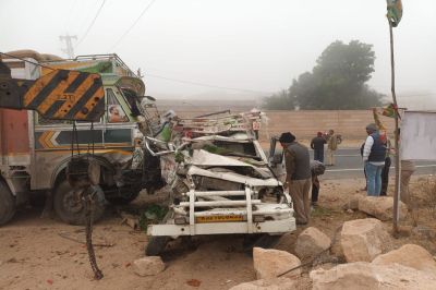 मूण्डवा. नागौर-अजमेर राष्ट्रीय राजमार्ग- 58 पर बड़माता मंदिर के पास सोमवार सुबह करीब आठ बजे लोडिंग वाहन व ट्रक की भिड़न्त हो गई। हादसे में दो जनों की मौत हो गई, जबकि चार जने घायल हो गए। दुर्घटना घने कोहरे बीच ओवरटेक करने से हुई। हादसा इतना भीषण था कि लोडिंग वाहन के आगे से परखच्चे उड़ गए और चालक उसमें बूरी तरह फंस गया। दुर्घटना होते ही ट्रक चालक मौके से भाग गया।