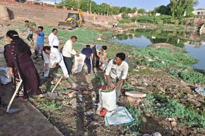 नागौर. वंदे गंगा जल संरक्षण अभियान के तहत सोमवार सुबह प्रतापसागर तालाब परिसर में शहरवासियों ने नगर परिषद कर्मचारियों के साथ श्रमदान कर दो घंटे तक पसीना बहाया। अथक मेहनत के बाद तालाब के पूर्वी दिशा का घाट व परिसर चमक उठा। रविवार को बैठक में हुए निर्णय अनुसार सोमवार सुबह सवा छह बजे नगर परिषद के कार्यवाहक आयुक्त एवं उपखण्ड अधिकारी गोविंद सिंह भीचर के नेतृत्व में कर्मचारी एवं अधिकारी संसाधनों के साथ तालाब पहुंच गए।