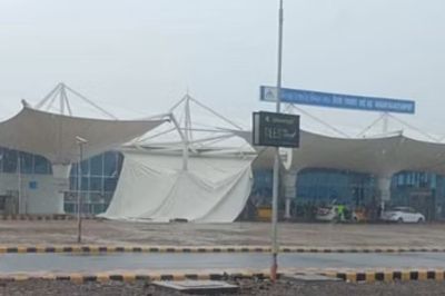Rajkot: शनिवार को हुई बारिश के बाद हीरासर स्थित इंटरनेशनल एयरपोर्ट पर टर्मिनल के बाहर पैसेंजर पिकअप-ड्रॉप एरिया में ऊपर लगी कैनोपी ढह गई।