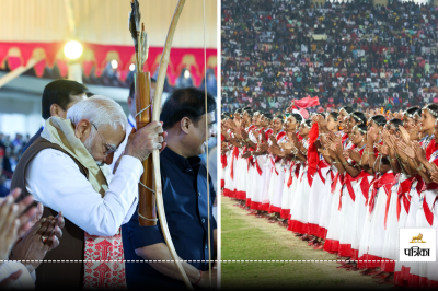 Jhumoir Binandini PM Modi in Assam: प्रधानमंत्री नरेंद्र मोदी ने सरुसजाई स्टेडियम में 'झुमोर बिनंदिनी' कार्यक्रम से पहले गुवाहाटी में एक रोड शो किया। बता दें कि झुमोर असम चाय जनजाति और आदिवासी समुदायों का एक लोक नृत्य है जो समावेशिता, एकता और सांस्कृतिक गौरव की भावना का प्रतीक है, और असम के समन्वित सांस्कृतिक मेलजोल का प्रतीक है।पीएम मोदी राज्य के दो दिवसीय दौरे पर हैं और कल एडवांटेज असम 2.0 का उद्घाटन करेंगे। गुवाहाटी पहुंचने पर एयरपोर्ट पर असम के सीएम हिमंत बिस्वा सरमा ने पीएम मोदी का स्वागत किया।