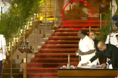 वीडियो में देखा जा सकता है कि शपथ के दौरान एक तरफ राष्ट्रपति महोदया बैठी हैं और दूसरी तरफ मध्य प्रदेश से आने वाले सांसद दुर्गा दास शपथ के बाद पेपर पर हस्ताक्षर कर रहे हैं। इसी बीच एक संदिग्ध जानवर वहां टहलता हुआ नजर आता है। वह एक साइड से दूसरी साइड जा रहा होता है और तभी कैमरे में कैद हो जाता है। इसके बाद जानवर का यह वीडियो सोशल मीडिया पर तेजी से वायरल हो गया है। वीडियो को @utkarshs88 नाम के एक्स अकाउंट से शेयर किया गया है।