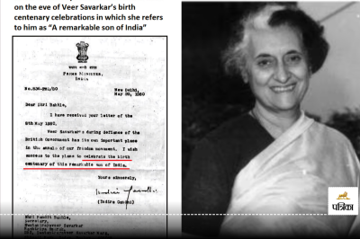 इंदिरा गांधी ने 20 मई 1980 को पंडित बाखले, सचिव, वीर सावरकर राष्ट्रीय स्मारक के नाम से संबोधित चिट्ठी में वीर सावरकर के योगदान का जिक्र किया था। दरअसल, यह चिट्ठी पंडित बाखले के पत्र के जवाब में लिखी गई थी। इस चिट्ठी में पूर्व पीएम इंदिरा गांधी ने लिखा था, ''मुझे आपका पत्र 8 मई 1980 को मिला था। वीर सावरकर का ब्रिटिश सरकार के खिलाफ मजबूत प्रतिरोध हमारे स्वतंत्रता आंदोलन के लिए काफी अहम है। मैं आपको देश के महान सपूत (रिमार्केबल सन ऑफ इंडिया) के शताब्दी समारोह के आयोजन के लिए बधाई देती हूं।'