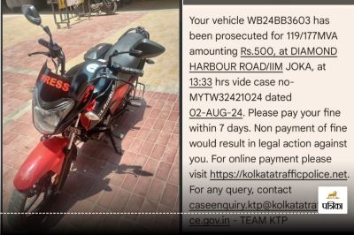 दरअसल, प्रीतम को शुक्रवार 2 अगस्त, 2024 को मोबाइल फोन पर एक मैसेज आया। मैसेज में लिखा था, आपके वाहन WB24BB3603 पर 119/177MVA के तहत 500 रुपये की राशि के लिए डायमंड हार्बर रोड/आईआईएम जोका पर 13:33 बजे मुकदमा दायर किया गया है। इसका मामला संख्या- MYTW32421024 दिनांक 02-AUG-24 है। कृपया 7 दिनों के भीतर अपना जुर्माना भरें। जुर्माना न भरने पर आपके खिलाफ कानूनी कार्रवाई की जाएगी। ऑनलाइन भुगतान के लिए कृपया https://kolkatatrafficpolice.net पर जाएं। किसी भी प्रश्न के लिए, संपर्क करें
