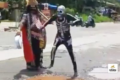 Yamraja Viral Video: इस राज्य में पारंपरिक सुनहरी पोशाक पहनकर 'यमराज' ने सड़कों पर बने गड्ढों पर लंबी छलांग लगवाने की प्रतियोगिता आयोजिक करवाई। इस प्रतियोगिता में भूत ने भी प्रतियोगिता में भाग लिया।