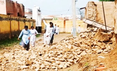 अनूपगढ़. गली में पड़ा दीवार का मलबा और ईंटें।