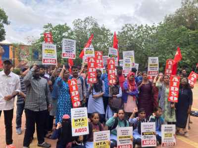 मेडिकल, डेंटल, आयुष और नर्सिंग कॉलेजों में दाखिले के लिए राष्ट्रीय परीक्षा एजेंसी (एनटीए) की ओर से आयोजित राष्ट्रीय पात्रता सह प्रवेश परीक्षा (NEET) 2024 में कथित तौर पर बड़े पैमाने पर विसंगति व धांधली के मामले में न्यायिक जांच व दोषियों के खिलाफ कड़ी सजा की मांग को लेकर अखिल भारतीय लोकतांत्रिक छात्र संगठन (एआइडीएसओ) के बैनर तले मंगलवार को विद्यार्थियों सहित अभिभावकों ने Bengaluru के फ्रीडम पार्क में प्रदर्शन किया।