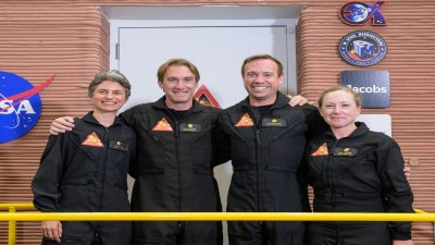 वैज्ञानिक एंका सेलारियू, रॉस ब्रॉकवेल, नाथन जोन्स और कनाडाई जीव विज्ञानी केली हेस्टन विशेष कमरे में 378 दिन बिताने के बाद शनिवार को बाहर आए।
