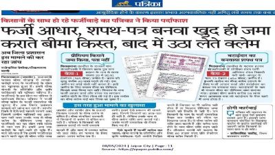 बीमा कंपनी के मैनेजर व उनके कर्मचारी किसान के यहां पहुंचे। पूछताछ और पड़ताल के बाद कर्मचारी ने खेत में लगातार चार साल से शत प्रतिशत फसल खराबे का कारण पूछा। प्रार्थी का कहना था कि उसने तो फसल बोई तक नहीं है। इस पर बीमा कर्मचारी ने कंप्यूटर में खेत, खसरों की फसल बीमा करना व भुगतान दावों के अनुसार चार वर्ष में करीब 20 लाख रुपए फसल बीमा राशि प्रार्थी के खेत खसरा नंबर 168, 176 में होने की जानकारी सामने आई। यह क्लेम राशि गणपतलाल पुत्र दीपाराम व सिणगारी पत्नी गणपतलाल पुरोहित निवासी अणखोल के खातों में ट्रांसफर किए हुए।