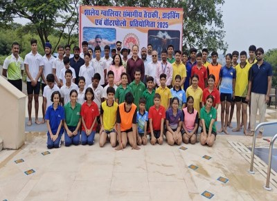 ग्वालियर. जिला शालेय क्रीड़ा विभाग की 69वीं ग्वालियर संभागीय शालेय तैराकी चयन प्रतियोगिता सिंधिया स्कूल फोर्ट के स्विमिंग पूल में बुधवार को आयोजित हुई। अंडर-14, 17 एवं 19 आयु वर्ग में आयोजित इस प्रतियोगिता (तैराकी, डाइविंग और वाटरपोलो) में बालक-बालिका तैराकों ने छलांग लगाई। ग्वालियर जिले के तैराकों ने शानदार प्रदर्शन कर ओवरआल चैंपियन ट्राफी जीत ली।