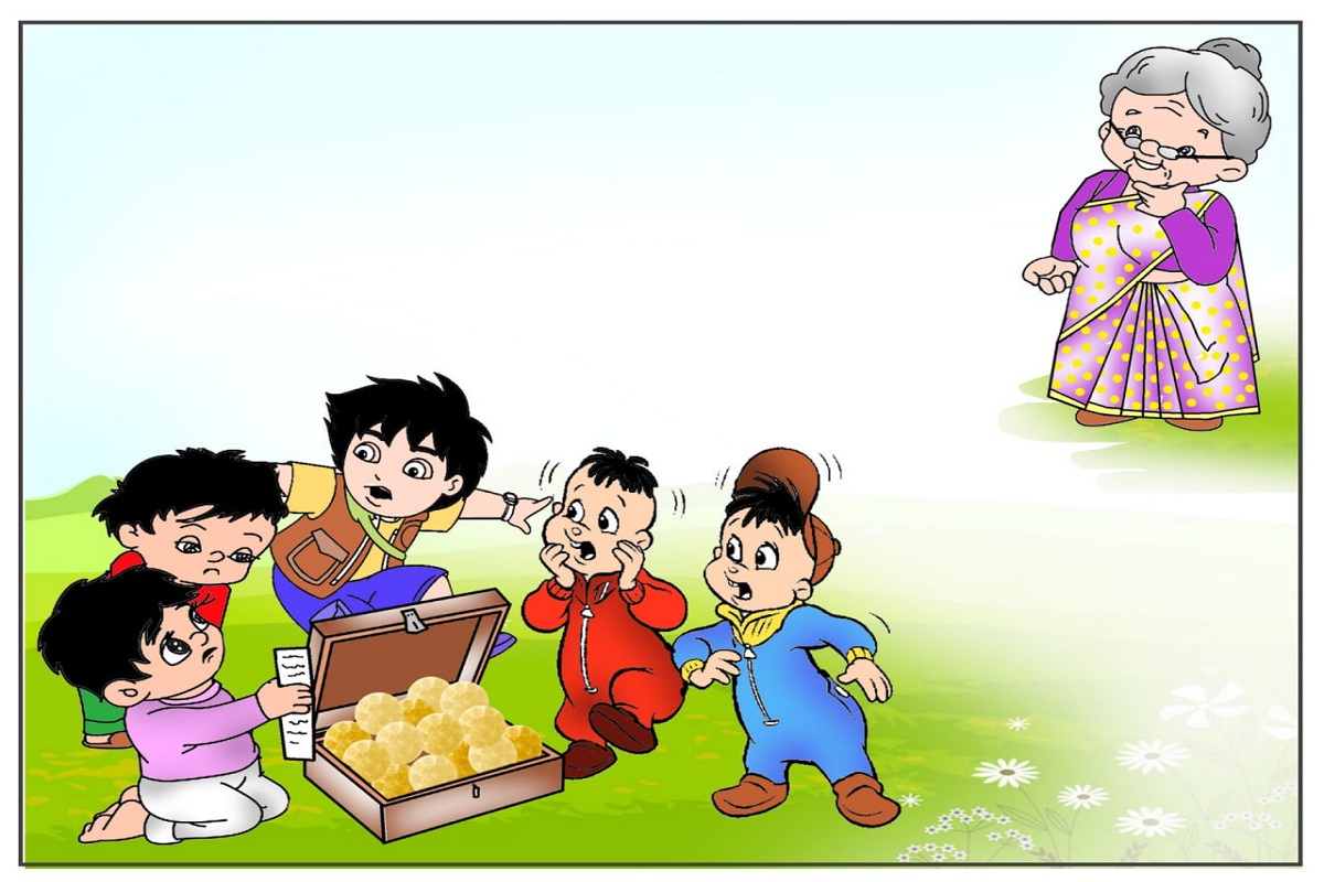 एक छोटे से गांव में पांच बच्चे रहते थे, जो हमेशा साथ में खेलते और मजाक करते थे। एक दिन उनमें से एक बच्चे ने एक पुरानी तिजोरी को घर के पीछे से निकाला। तिजोरी को खोलने पर उन्हें आश्चर्य हुआ जब उन्होंने देखा कि उसमें स्वर्ण लड्डू भरे हुए थे। बच्चों ने तिजोरी के बारे में चर्चा करना शुरू किया और तय किया कि वे इसे अपने बीच में बांट लेंगे। लेकिन, तभी उनकी दादी ने उन्हें दूर से देखा और पूछा, तुम लोग यहां क्या कर रहे हो?