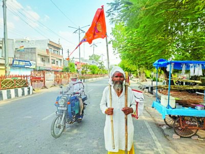 बल्देवगढ़ ब्लॉक की ग्राम पंचायत डुम्बार के ग्राम प्रतापपुरा निवासी प्यारेलाल पाल 52 वर्ष एक हाथ में ध्वज तो दूसरे हाथ में एक लाठी लिए गर्मी को चुनौती देते हुए आगे बढ़ रहे है। उनकी पीठ पर जरूरत का सामान बंधा हुआ है और वह भगवान का स्मरण करते हुए ओरछा के मार्ग पर चले जा रहे है। प्यारेलाल से तपती गर्मी में सूनी पड़ी सड़क पर इस प्रकार सफर करने का कारण पूछा तो उन्होंने बताया कि वह बांके बिहारी के दर्शन करने वृंदावन जा रहे है। वहां पर गोवर्धन जी की परिक्रमा करेंगे। इसके पूर्व कल शाम तक वह ओरछा पहुंचेंगे और वहां पर श्रीरामराजा के दर्शन करेंगे। प्यारेलाल ने प्रतापपुरा से बुधवार की सुबह 4 बजे अपनी यात्रा शुरू की थी और वह सीधे सिद्ध क्षेत्र बगाज माता मंदिर पहुंचे थे। यहां पर माता के दर्शन करने के बाद गुरुवार की सुबह कुण्डेश्वर पहुंचे और यहां पर भगवान शंकर को जल अर्पित कर अपनी आगे की यात्रा शुरू की।