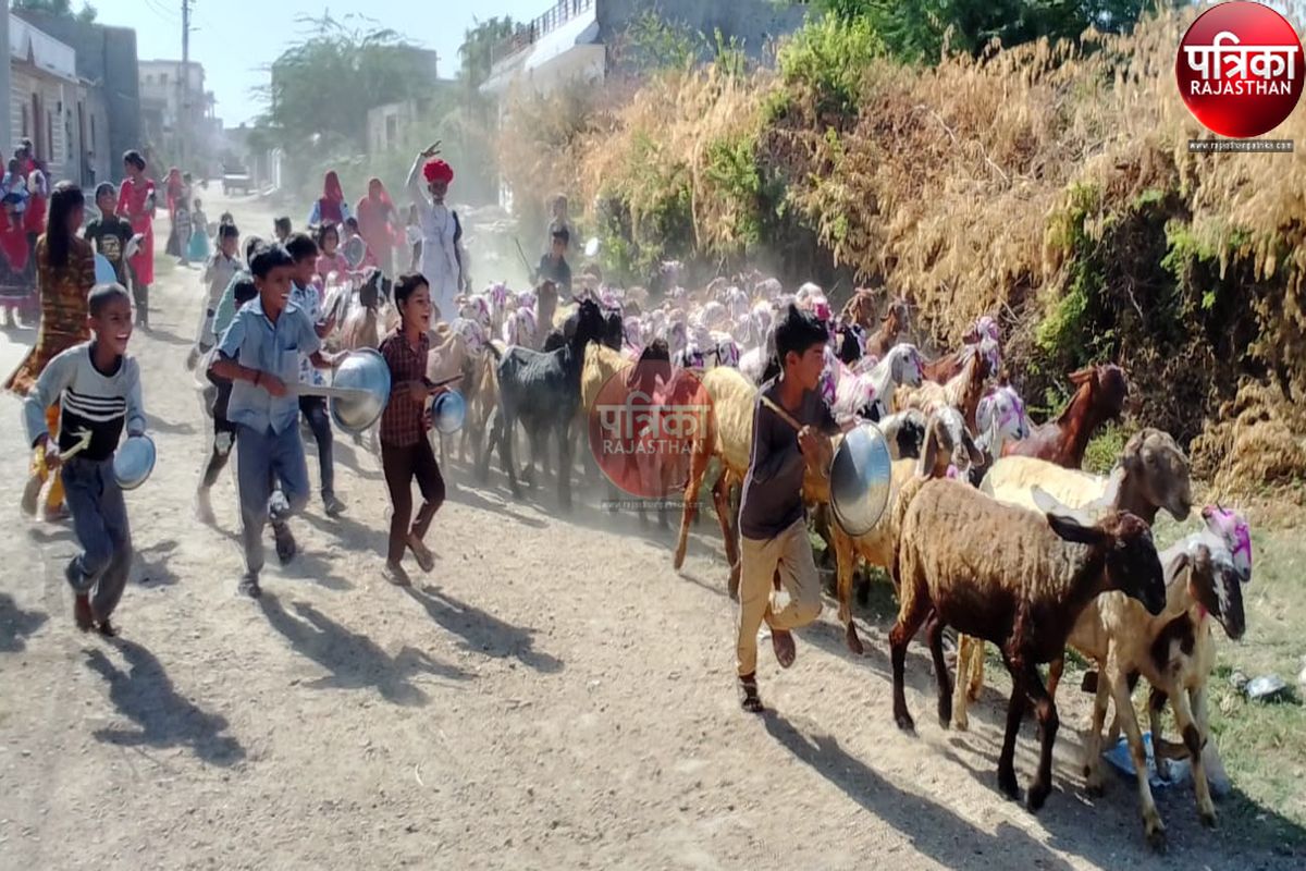 कीरवा. गांव में चरवाहों ने परम्परानुसार पशुधन गाय, भेड़ -बकरियों को सतरंगी रंगो से रंगकर बाड़े से बाहर निकाला और बाद में हाथों में बर्तन और डण्डे लिए पहले से ही मौजूद बच्चों व महिलाओं ने रेवड को भड़काकर खूब दौड़ाया। जोगाराम देवासी, वीराराम देवासी, कालुराम देवासी, भीकाराम देवासी, भावाराम देवासी ने बताया कि प्राचीन काल से गोवर्धन पूजा के दिन पशुओं की पूजा अर्चना कर पशुओं को रंगने से वर्षभर पशुओं को बीमारी की आशंका नहीं रहती है। पुजारी राणाराम देवासी, वार्डपंच पाबुदेवी देवासी, भीकाराम देवासी, हवाराम देवासी, नेतीराम देवासी, वीराराम देवासी, कालुराम देवासी, रामलाल देवासी ने बताया कि यह परम्परा हमारे पूर्वजों से हमें विरासत में मिली है। जिसे आज भी हम उत्साह से निभा रहे हैं।