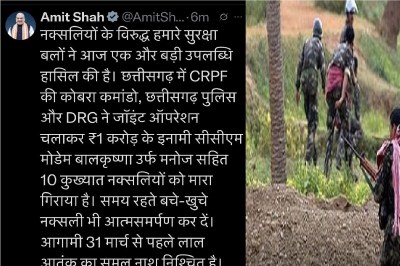 सीएम साय ने अपनी पोस्ट में यह भी बताया कि इसके अलावा नारायणपुर में जनताना सरकार सदस्य, पंचायत मिलिशिया डिप्टी कमांडर, पंचायत सरकार सदस्य और न्याय शाखा अध्यक्ष सहित 16 नक्सलियों ने आत्मसमर्पण किया है। यह इस बात का स्पष्ट प्रमाण है कि नक्सलियों की विचारधारा अब दम तोड़ रही है। सीएम ने कहा कि हमें पूर्ण विश्वास है कि मार्च 2026 तक प्रधानमंत्री नरेंद्र मोदी के मार्गदर्शन और केंद्रीय गृहमंत्री अमित शाह के नेतृत्व में नक्सलमुक्त भारत बनेगा।