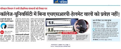 परिवहन विभाग ने प्रदेश के सभी शैक्षणिक संस्थानों के प्राचार्य और डॉयरेक्टरों को पत्र लिखकर बिना एचएसआरपी वाले वाहन चालकों के संस्थान में प्रवेश पर रोक लगाने कहा है। सुप्रीम कोर्ट के आदेश के मुताबिक राज्य में 1 अप्रैल 2019 से पहले के सभी रजिस्टर्ड सभी वाहनों में एचएसआरपी लगाना अनिवार्य है।