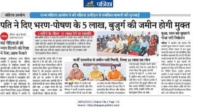 छत्तीसगढ़ राज्य महिला आयोग ( Chhattisgarh State Women Commission ) का प्रयास रंग लाया। महिला (The woman) ने आयोग ( commission ) से सहायता मांगी और इस पर आयोग ने पति को समझाया। इसके बाद आरोपी पति ने दोनों बच्चों के भरण-पोषण के लिए ( maintenance of both the children) प्रति माह 6 हजार रुपये देने का प्रस्ताव रखा। भरण-पोषण की पहली किस्त महिला को दी ।