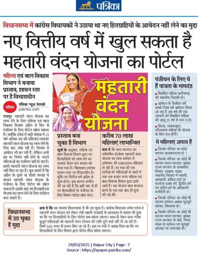 सूत्र बताते हैं कि अप्रैल के दूसरे या तीसरे सप्ताह में शासन महतारी वंदन योजना के पंजीयन के लिए पोर्टल को खोल सकता है। इसके बाद नए हितग्राही इस योजना का लाभ लेने के लिए पंजीयन करा सकते हैं। सूत्रों के अनुसार, महिला एवं बाल विकास विभाग द्वारा नए हितग्राहियों को लाभ देने का प्रस्ताव तैयार कर शासन को भेजा गया है। फिलहाल प्रस्ताव शासन स्तर पर विचाराधीन है। चूंकि नए वित्तीय वर्ष अप्रैल से शुरू होगा। इस कारण उम्मीद की जा रही है कि इसी माह से ही नए हितग्राहियों के पंजीयन के लिए विभाग पोर्टल खेल देगा।
