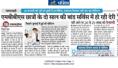 छत्तीसगढ़ प्रदेश के 6 सरकारी मेडिकल कॉलेजों से इंटर्नशिप पूरी करने वाले 800 से ज्यादा छात्रों ( more than 800 students ) की दो साल की बांड पोस्टिंग में देरी ( delay in posting of two-year bond ) हो रही है। दरअसल इन छात्रों की इंटर्नशिप 28 फरवरी को पूरी हो चुकी है। यानी डेढ़ माह बाद भी पोस्टिंग नहीं हुई है। छात्रों को पोस्टिंग का इंतजार (waiting for posting.) है।