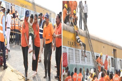 कोच के डिरेल होने पर होने वाली स्थितियों को निर्मित किया गया। सवारी गाड़ी के डिब्बे में आग लगने की स्थिति को दर्शाते हुए यह बताया गया कि इस दौरान कैसे पीडितों को सुरक्षित बाहर निकाला जाए एवं उनकी सहायता की जाए। रेलवे कोच को काट कर यात्रियों को निकालने के नवीन संसाधनों का उपयोग किया जाए।