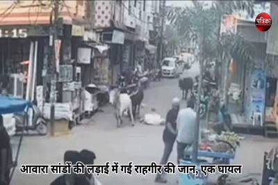 MP NEWS: मध्यप्रदेश के राजगढ़ जिले के नरसिंहगढ़ में बीच बाजार रविवार शाम को हुई एक घटना ने हर किसी को झकझोर कर रख दिया। घटना नरसिंहगढ़ के दीनाजी चौराहे की है जहां दो आवारा मवेशी (सांड) की लड़ाई में एक शख्स की जान चली गई वहीं एक अन्य शख्स गंभीर रूप से घायल हुआ है जिसे गंभीर हालत में अस्पताल में भर्ती कराया गया है। घटना का एक सीसीटीवी फुटेज सामने आया है जो हैरान कर देने वाला है।