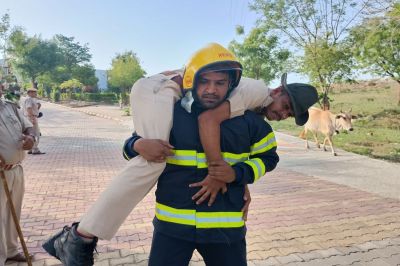 राजसमंद. सुबह जैसे ही पुलिस लाइन स्थित अन्वेषण भवन में ड्रोन से एयर स्ट्राइक की सूचना मिली, पूरा प्रशासन हरकत में आ गया। चारों ओर सायरन बजने लगे, सुरक्षा बलों के कदम तेज़ हो गए और प्रशासनिक तंत्र की घड़ी की सूइयों से भी तेज़ गति दिखी। पहला अलर्ट मिलते ही जिला कलेक्टर बालमुकुंद असावा, एडीएम नरेश बुनकर, एडिशनल एसपी महेंद्र पारीक और रजत विश्नोई समेत तमाम आला अधिकारी मौके पर रवाना हो गए। पूरे परिसर में सन्नाटा और सतर्कता का मिला-जुला दृश्य नजर आने लगा।पुलिस, फायर ब्रिगेड, सिविल डिफेंस और मेडिकल टीमें एक साथ पहुंचींजैसे ही सूचना मिली, नगर परिषद की फायर ब्रिगेड धूं-धूं कर उठती आग की लपटों के बीच घुसी और बिना समय गंवाए आग पर काबू पा लिया। इधर, घायल जवानों को संभालने के लिए सिविल डिफेंस और पुलिसकर्मी मौके पर डटे हुए नजर आए। एक जवान को कंधे पर उठाकर सीढ़ियों से नीचे लाया गया, यह दृश्य मॉक ड्रिल की गंभीरता और टीम की मुस्तैदी का जीवंत प्रमाण बन गया।