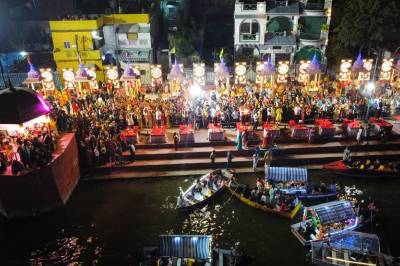 कथा वाचक इंद्रेश उपाध्याय का स्वागत कर आतिशबाजी की गई। इस मौके पर कथावाचक इन्द्रेश उपाध्याय ने कहा कि यह आयोजन हरिद्वार व बनारस जैसा ही है। उन्होंने चकराघाट पर किए गए सौंदर्यीकरण के कार्यों व नवग्रह मंडपम की भी प्रशंसा की। उन्होंने विधायक शैलेन्द्र जैन, निगमायुक्त राजकुमार खत्री, भाजपा जिलाध्यक्ष श्याम तिवारी के साथ नाव में बैठकर नौका विहार का आनंद लिया।