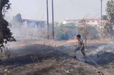झाड़ियां व सूखी घास होने के कारण आग तेजी से फैली और कुछ ही देर में ऊंची-ऊंची लपटे उठने लगीं। आग लगने का कारण पास से निकली 11 केवी हाइटेंशन लाइन में स्पार्किंग बताया जा रहा है।