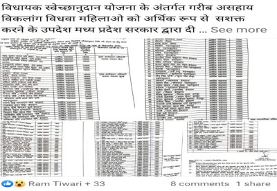 बीना. विधायक को मिलने वाली स्वेच्छानुदान निधी अपनों और एक ही परिवार के कई सदस्यों को वितरित करने का मामला सामने आया है। तीस लाख रुपए की राशि की सूची सोशल मीडिया पर वायरल हो रही है। यह राशि गरीब, असहाय, विकलांग, विधवा सहित अन्य जरूरतमंद लोगों वितरित करने उपलब्ध कराई जाती है।