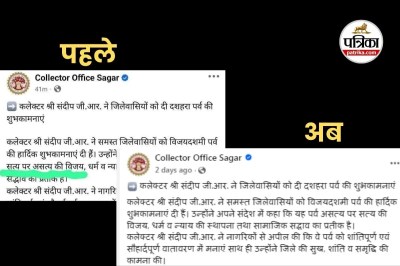 पोस्ट में लिखा था कि कलेक्टर श्री संदीप जी.आर. ने जिलेवासियों को दी दशहरा पर्व की शुभकामनाएं। कलेक्टर श्री संदीप जी.आर. ने समस्त जिलेवासियों को विजयदशमी पर्व की हार्दिक शुभकामनाएं दी हैं। उन्होंने अपने संदेश में कहा कि यह पर्व सत्य पर असत्य की विजय, धर्म व न्याय की स्थापना तथा सामाजिक सद्भाव का प्रतीक है। कलेक्टर श्री संदीप जी.आर. ने नागरिकों से अपील की कि वे पर्व को शांतिपूर्ण एवं सौहार्दपूर्ण वातावरण में मनाएं साथ ही उन्होंने जिले की सुख, शांति व समृद्धि की कामना की। हालांकि, बाद में पोस्ट में सुधार करते हुए असत्य पर सत्य कर दिया गया।