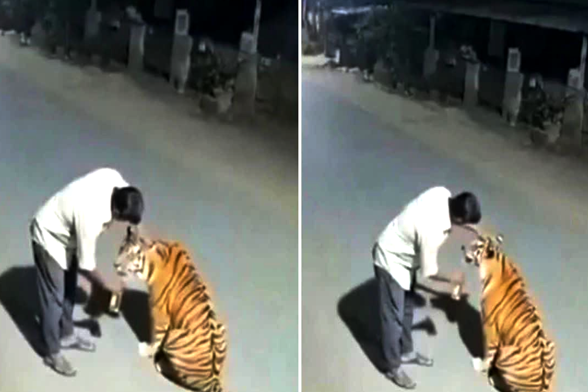 वायरल वीडियो में सामने आई चौंकाने वाली ये घटना 4 अक्टूबर 2025 की बताई जा रही है। साथ ही, दावा किया गया कि, राजू पटेल जो रोज की तरह काम खत्म कर ठर्रे की दुकान पर गया था। देर रात पत्ते खेलने और ठर्रा पीने के बाद नशे में धुत हो गया। पत्ते खेलकर अपने घर लौट रहा था तो रास्ता सुनसान था और इसी दौरान, सड़क के किनारे अचानक उसकी नजर एक बड़े से जानवर पर गई। इस बड़े जानवर को देखकर नशे में धुत राजू को जरा भी डर नहीं लगा। क्योंकि ये बड़ा सा जानवर एक रॉयल बंगाल टाइगर था जो राजू को कभी बिल्ली तो कभी कुत्ता नजर आ रहा था। नशे में झूमते हुए राजू उसके पास गया और बोतल में बची शराब उसकी ओर बढ़ा दी। वायरल वीडियो में राजू उसे सहलाता हुआ भी नजर आ रहा है। फिलहाल, वायरल हो रहा वीडियो पूरी तरह से नकली और भ्रामक है।
