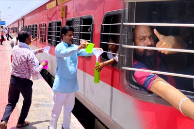 Jal Seva : बदरवास रेलवे स्टेशन पर 'जल सेवा' कर रहे रेलवे सुविधा संघर्ष समिति के सदस्य। नियमित रूप से आमजन को RO कैंपर से ठंडा पानी पिलाया जा रहा है।