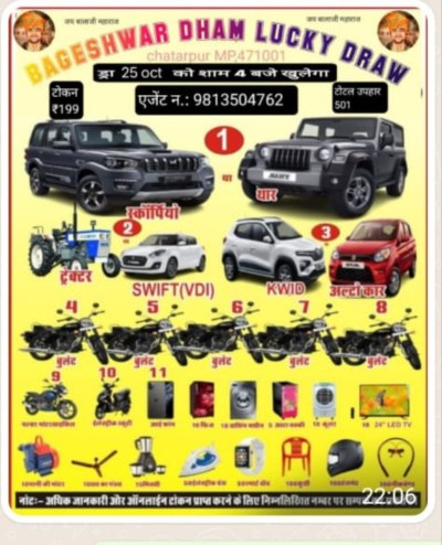 जयपुर. प्रदेशभर में बागेश्वर धाम के नाम पर लकी ड्राॅ जीतने का झांसा देकर साइबर ठगी की जा रही है। साइबर ठगों ने बागेश्वर धाम के नाम का गलत इस्तेमाल कर सोशल मीडिया पर कई फर्जी अकाउंट बनाए हैं। वाट्सऐप सहित अन्य प्लेटफॉर्म पर बागेश्वर धाम के वीडियो के लिंक भेजे जा रहे हैं। इन पर क्लिक करते ही ठगों तक मैसेज चला जाता है। इसके बाद ठगों की ओर से 199 रुपए में लकी ड्रॉ का एक कूपन दिया जाता है।