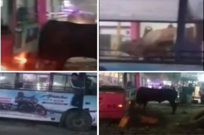 दरअसल वीडियो में दिख रहा है कि एक पब्लिक प्लेस पर एक बस खड़ी थी। उसका चालक और परिचालक उसमें बैठे थे। अचानक वहां पर दो भारी-भरकम सांड आ गए। उसके बाद शायद वह बाहर नहीं निकल पाए और बस में ही फंस गए। गुस्से में बस के शीशे तोड़ दिए और सीटों को उखाड़ दिया।