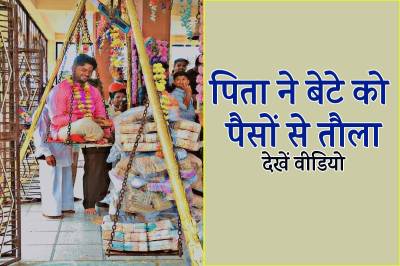 father weighed son with money: मध्यप्रदेश के उज्जैन में एक पिता ने अपने जवान बेटे को पैसों से तौल दिया। अनोखा मामला उज्जैन जिले के बड़नगर का है जहां तेजा दशमी पर्व पर एक पिता ने अनूठी मिसाल पेश करते हुए अपनी मन्नत पूरी होने पर अपने बेटे को उसके वजन के बराबर के रुपयों की गड्डियों से तौल दिया। पैसों से बेटे की तुलाई का वीडियो सामने आया है और तेजी से वायरल हो रहा है।