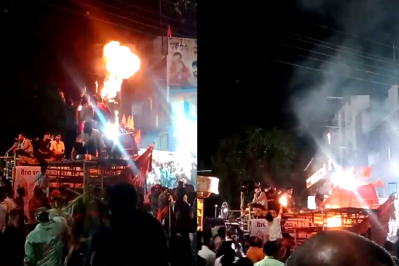 Man Spitting Fire : पारंपरिक जल समारोह में मौत को दावत देती तस्वीरें सामने आईं। मुंह में पेट्रोल भरकर आग के स्टंट कर रहा था युवक। अचानक भड़की आग की लपटों ने 4 लोगों को चपेट में लिया। वाहन से कूदकर लोगों ने जान बचाई।