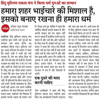 हिंदू मुस्लिम एकता मंच उमरिया द्वारा सभी धर्म गुरुओं का सम्मान एवं ब्लड डोनेट का कार्यक्रम किया गया। मुस्लिम धर्म गुरु जामा मस्जिद के इमाम ने कहा कि हमारे नबी ने सभी को गले लगाया है। प्रेम का संदेश दिया भी और देने की बात भी कहीं है, जिसमे मजहब का कोई भेद न हो। हर धर्म और जाति के लोगों को गले लगाना है। हिंदू धर्म गुरु पंडित शंकर दयाल ने कहा कि एक साथ रहना ही धर्म है, इसके अलावा कोई और रास्ता नहीं, मैं मुस्लिमों के बीच रहता हूँ पर धर्म हमारे दोस्ती मोहब्बत के बीच कभी नहीं आया। हम अपने धार्मिक आयोजन भी साथ मिलकर करते हंै हमारा शहर भाईचारे की मिशाल है इसको बनाये रखना ही हमारा धर्म है। सिख धर्म गुरु गोविंद ने कहा कि धार्मिक सौहाद्र्र हमारी ताकत है और अपनी ताकत को हम ख़त्म नहीं करना चाहते हंै इसलिए सभी प्रभु के संतान हैं और धर्म प्रेम और भाईचारे के लिए बना है। ईसाई धर्म गुरु चर्च फादर ने कहा कि भारत देश किसी जाति धर्म का देश नहंीं है यहां सभी जाति धर्म के लोग रहते हंै और यदि देश सुख शांति अमन चैन चाहिए तो आपस में सभी को मिलकर रहना होगा। अभय पांडेय ने कहा कि मुल्क को बनाने वाले हम सब हैं। रमजान में राम हैं और दिवाली में अली।
