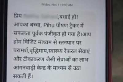 मैसेज में लिखा हुआ था कि पोषण ट्रैकर में आपका स्वागत है। एक स्तनपान कराने वाली मां के रूप में आप हॉट कुक्ड मिल या राशन, परामर्श, बाल स्वास्थ्य निगरानी और गृह भ्रमण के माध्यम से स्तनपान जैसी सेवाओं का लाभ आंगनबाड़ी केंद्र की सहायता से उठा सकती हैं।